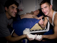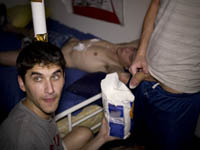 This shit was pretty funny. These dudes were fucking with one of their buddies who had passed out with his shoes on, putting shaving cream all over him, tea bagging him and slapping their cocks on his face giving him a mushroom stamp. Well of course this guy flips out and chases them down the hall.. he seemed really mad about the whole thing, and his friends were telling him to chill out.. I mean it's really not a big deal unless you're really gay right? So they made him PROVE he wasn't gay. Well shit.. that didn't really work out and this guy got hard as a rock..