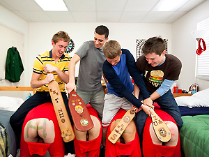 Fraternities are always fun. But sometimes you have to do some pretty iffy things to get accepted into the brotherhood. This week we received a pretty bizarre video from an east coast school. They had their pledges dress in assless PJs with the words HAZE written on their asses. These pledges had to suck cock and get stuffed up the butt in order to get accepted into the family.